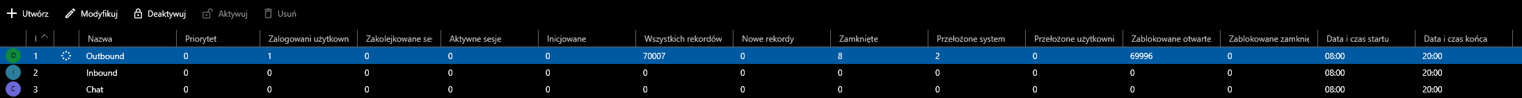 Na przecięciu nazwy kampanii i nazwy użytkownika priorytet. Agent jest przypisany jeżeli wartość jest większa od 0. Podwójne kliknięcie zwiększa priorytet o 1.