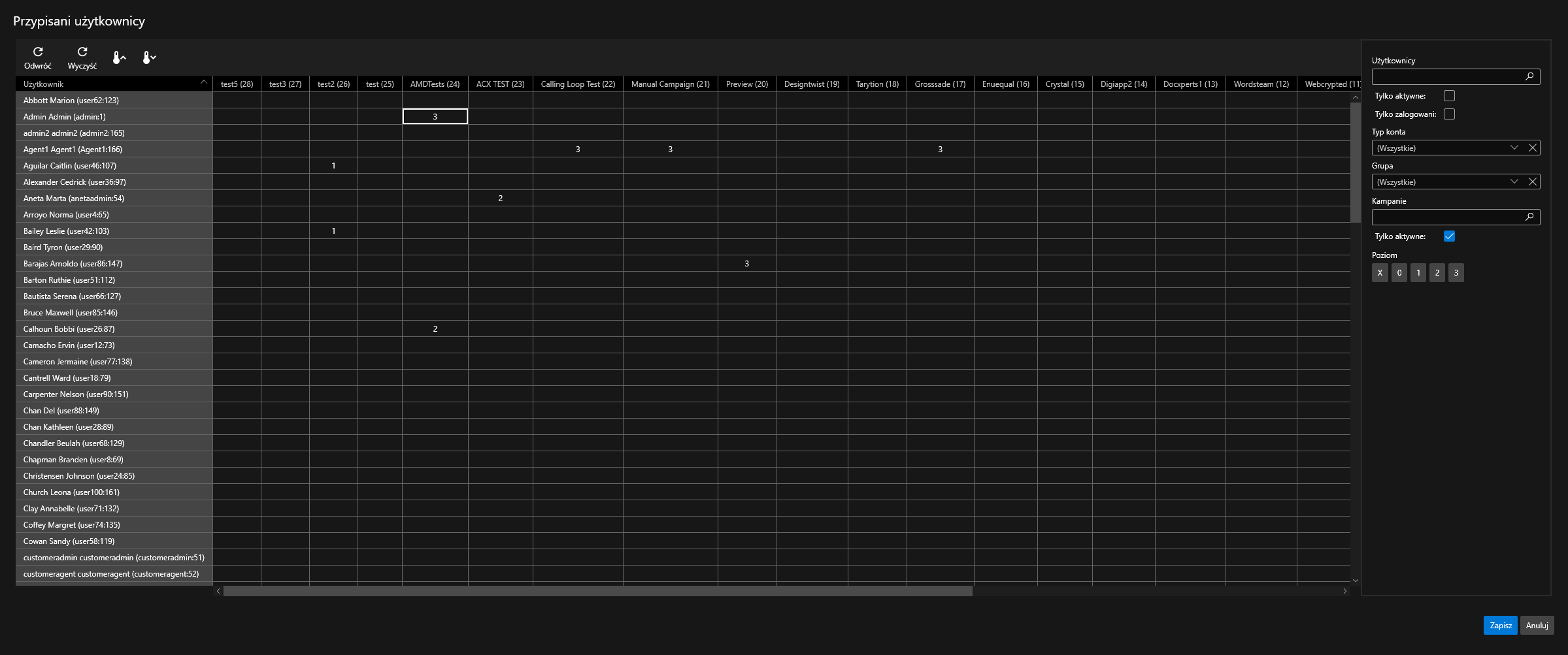Tabela przypisań użytkowników. W wierszach agenci w kolumnach kampanie.