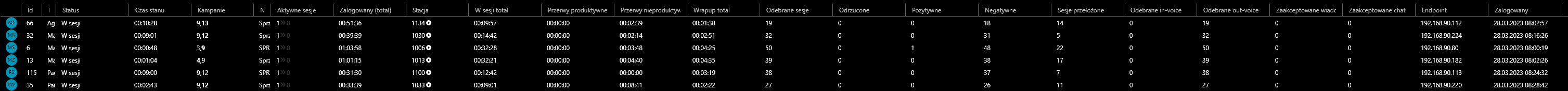Panel do monitoringu użytkowników zalogowanych do systemu. Na tym ekranie widoczne są dane tyczące się aktywności, wyników i statusów agentów. Z panelu można wejść w interakcjie z użytkownikiem oraz zarządzać jego stanem.