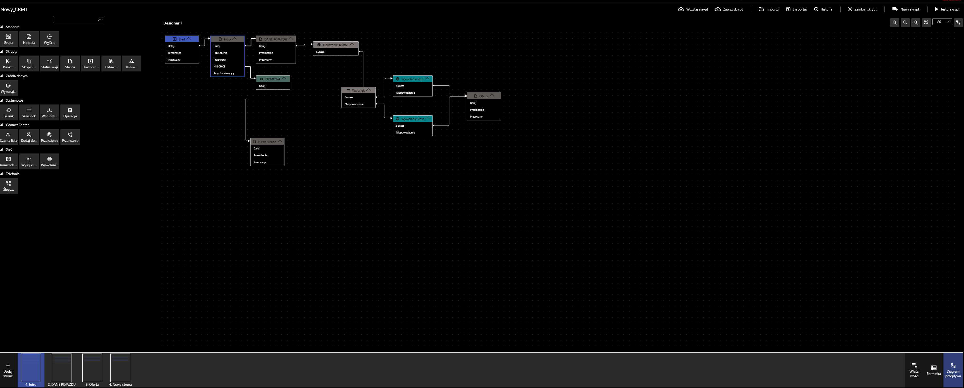 Skrypty są tworzone poprzez definiowanie przepływu sygnału na schemacie bloczkowym. Każdy bloczek reprezentuje jedną lub zestaw operacji do wykonania. Operacje są wykonywane zgodnie z przebiegiem sygnału, zobrazowanym strzałkami, poczynając od bloczka start wyjścia dalej. Połączenia są budowane poprzez przeciągnięcie strzałki z wyjścia z bloczka do kolejnego obiektu, przeciągnięcie strzałki w puste miejsce zerwie połączenie. Funkcje kontrolek (bloczków) można edytować klikając 2 razy na dany bloczek. Można również kopiować pojedyncze bloczki lub grupy ( zaznaczając obszar z danymi bloczkami), funkcjonują również skróty znane z systemu windows ctrl+c , ctrl+c, shift+click, Delete etc.