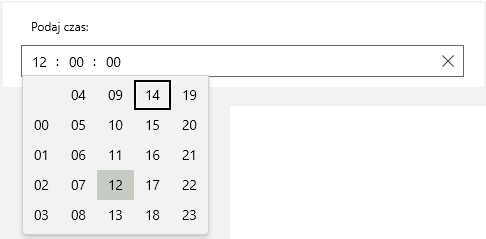 Zakres czasu: Kontrolka Czas może być skonfigurowana do akceptowania tylko czasu z określonego zakresu. Walidacja sprawdza, czy wprowadzony czas mieści się w tym zakresie.