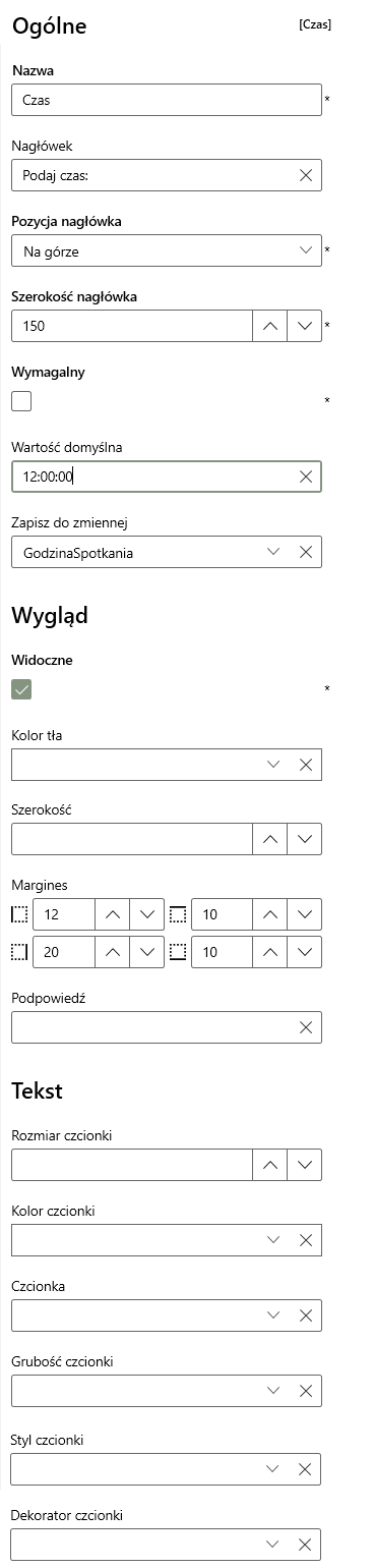 | Wymagalny | Określa, czy wypełnienie pola jest wymagalne. Jeśli pole Czas ustawimy jako wymagalne (true), to walidator nie pozwoli przejść na kolejną stronę skryptu, jeśli w pole Czas pozostanie puste (lub nie będą spełnione reguły walidacyjne z sekcji Data i czas, jeśli zostały zdefiniowane). |