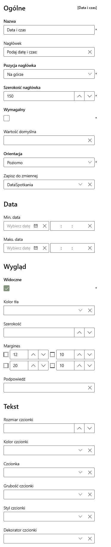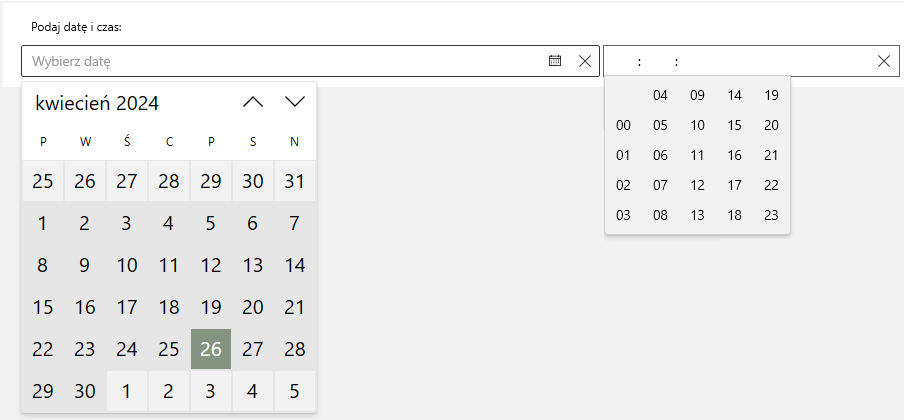 Kontrolka Data i czas umożliwia użytkownikowi wybór daty i czasu z kalendarza i zegara. Możliwe jest wpisanie daty i czasu za pomocą klawiatury lub wybór z wbudowanego graficznego kalendarza oraz zegara.