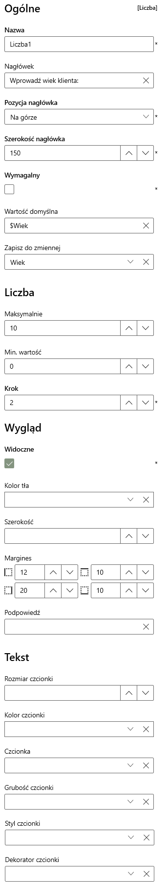 | Krok | Wielkość liczbowa, o jaką zwiększona zostanie wartość w polu Liczba po kliknięciu przycisków góra/dół. Np. wartość 2 oznacza, że jeśli w polu liczba początkowo będzie wartość 1 to po kliknięciu przycisku góra wartość w polu liczba będzie równa 3. |
