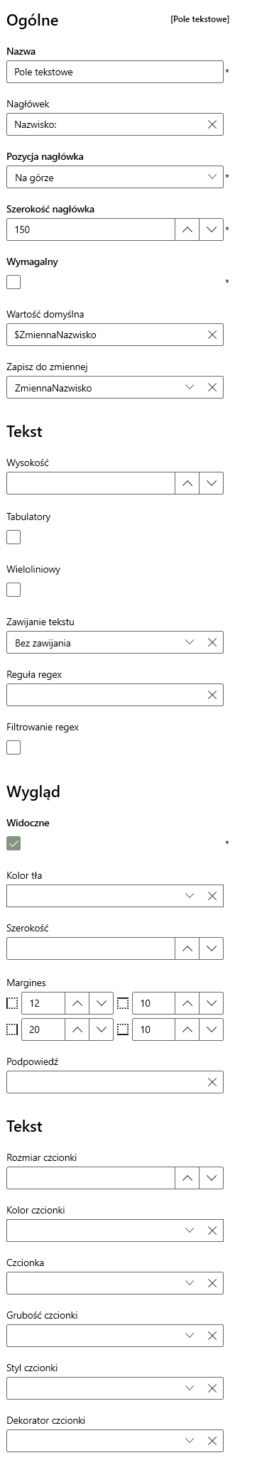 | Rozmiar czcionki | Definiuje rozmiar czcionki tekstu wyświetlanego w kontrolce Pole tekstowe |