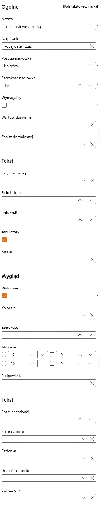 | Pozycja nagłówka | Określa położenie nagłówka względem pola tekstowego z maską, możliwe wartości to po lewej lub na górze. |