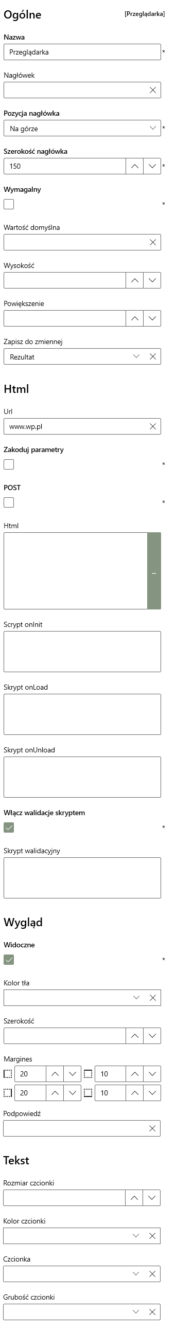 | Zapisz do zmiennej | Pozwala programowo zapisać wartość z kontrolki do zmiennej. Wartość ze zmiennej może być zapisana do bazy lub wykorzystana w kolejnych krokach skryptu. Szczegółowy opis jak pobrać wartość bezpośrednio ze strony html wyświetlanej w kontrolce przegladarka do zmiennej podano w opisie właściwości: Skrypt on unload Uwaga: Nie zapisanie zawartości pola Data do zmiennej nie oznacza utraty tej informacji po zamknięciu sesji skryptu. Wszystkie wartości pól edycyjnych są zapisywane w bazie danych bez względu na to, czy są przypisane do zmiennych, czy nie. |