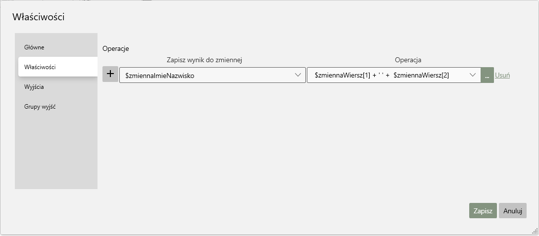 zmiennaImieNazwisko - do przechowywania wartości wyliczonej z kolumny drugiej i trzeciej wybranego przez użytkownika wiersza. Wyliczenie tej wartości odbywa się w bloczku “Operacja” w widoku “Diagram przepływu” skryptu.