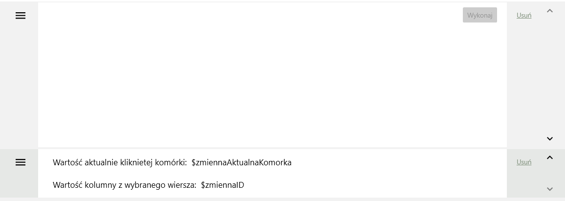 | Wybrana komórka do zmiennej | Określa zmienną do której zostanie przypisana wartość z aktualnie zaznaczonej przez użytkownika komórki tabeli. |
