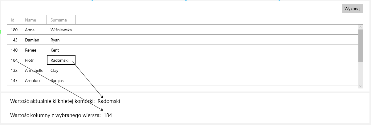 | Kolumna do zmiennej | Określa zmienną do której zostanie przypisana wartość z aktualnie zaznaczonego przez użytkownika wiersza i kolumny zdefiniowanej we właściwości “Nazwa kolumny do zmiennej” |