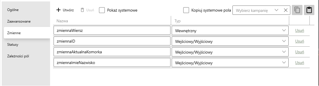 | Wybrany wiersz do zmiennej | Określa zmienną do której zostanie przypisany aktualnie zaznaczony przez użytkownika wiersz tabeli. Do poprawnego działania wymagane jest aby zamienna była typu “Wewnętrzny”. |