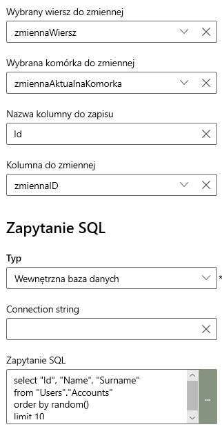 | Nazwa kolumny do zapisu | Właściwość sparowana z kolejną właściwością ("Kolumna do zmiennej"), określa nazwę kolumny z której wartość zostanie przypisana do zmiennej. |