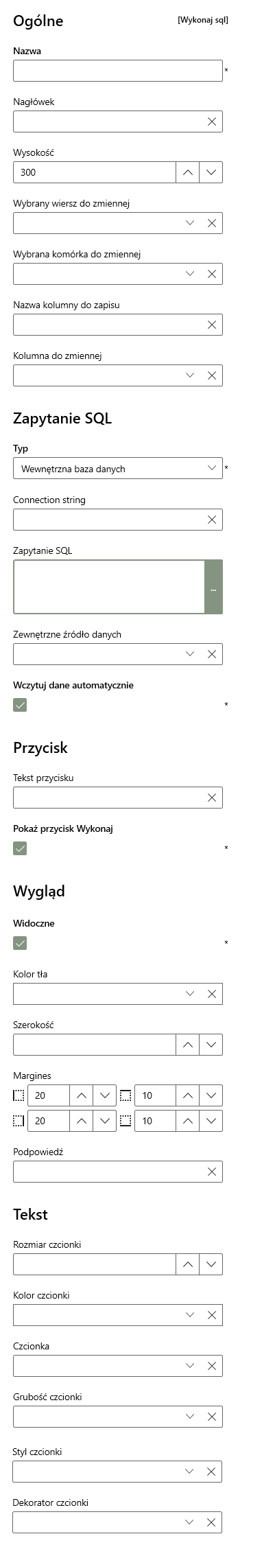 | Wczytuj dane automatycznie | Określa czy dane mają zostać wczytane automatycznie po wyświetleniu strony skryput bez konieczności kliknięcia przez użytkownika w przycisk “Wykonaj”. Jeśli chcemy aby zapytanie wykonało się tylko raz należy ustawić tę właściwość na Tak oraz właściwość “Widoczne” na Nie |