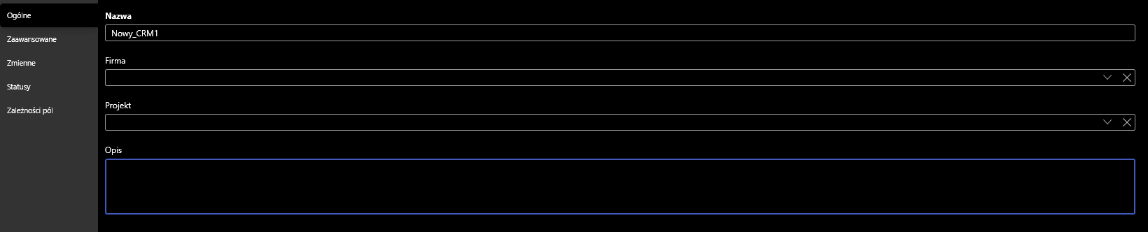 Podstawowe ustawienia skryptu - Nazwa, Przypisanie do Firmy i projektu oraz opcjonalny opis.