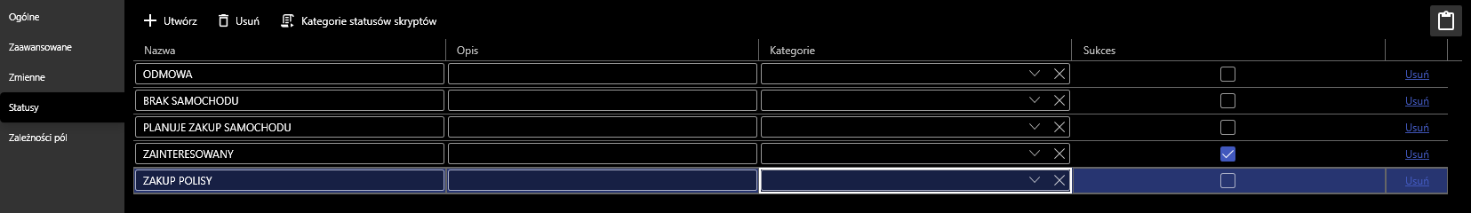 Definicje efektów kończących rozmowę, możliwość dodania dowolnej ilości statusów oraz wskazania, które mają być interpretowane jako sukces. (na potrzeby raportowe, np. sprzedaże, leady etc.). Dodatkowo możliwość zbierania statusów w kategorie np. odmowy, oddzwonienia w celu oznaczania rozmów dwupoziomowo.