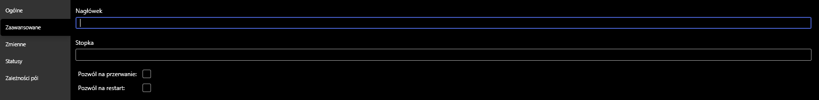 Możliwość dodania stopki oraz nagłówka (będą widoczne na każdej stronie). Ustawienie możliwości Restartu oraz przerwania skryptu - odpowiednie przyciski będą widoczne w interfejsie agenta.