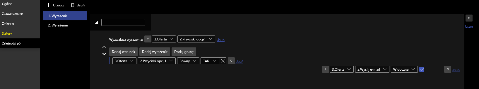 Sekcja do budowy warunków logicznych dynamicznych zmian parametrów formatek wykorzystanych w skrzypcie, np. pokazanie pola A, jeżeli pole B przyjmie wartość Y. Możliwość nieograniczonej ilości warunków.