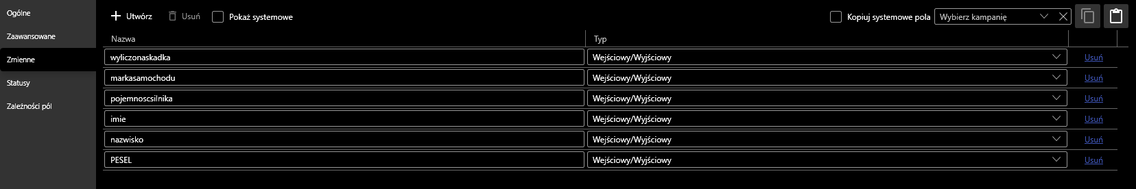 - Wejściowe - wartość początkowa zmiennej może zostać pobrana z rekordu kampanii