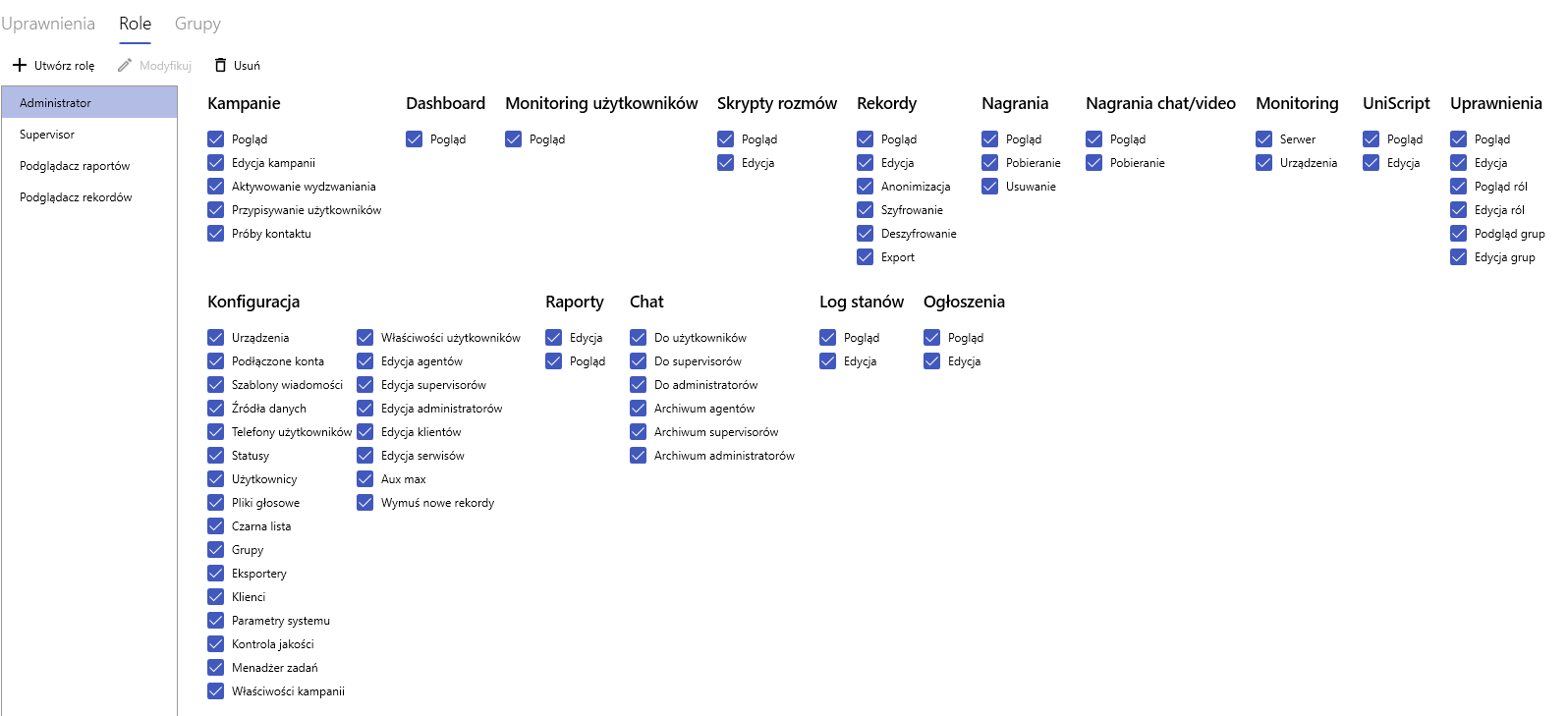 Użytkownik może mieć jednocześnie przypisanych wiele ról, np. dla jednego projektu może mieć tylko uprawnienia do podglądu agentów a dla innego do zarządzania kampaniami.